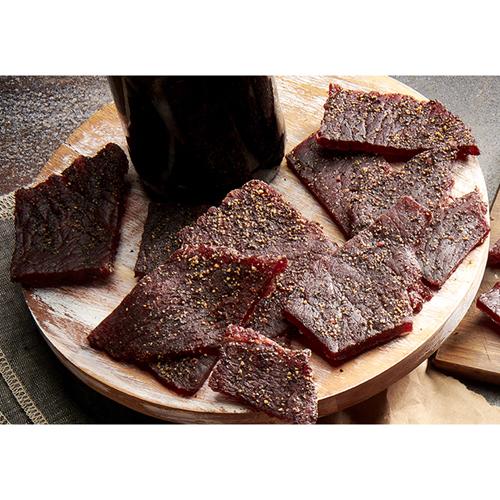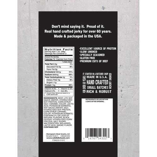 Wild Bill’s 4-Piece Black Peppered Beef Jerky Gift Bag is the perfect gift for those who love hickory smoked beef jerky with a kick of black pepper. Packed in a sheer black organza bag, there are four 3oz resealable packs of Wild Bill’s 3oz Black Peppered Beef Jerky. Wild Bill's Black Peppered Beef Jerky is the exact same jerky as the strips just cut in smaller pieces. This whole muscle beef jerky is marinated in soy sauce and seasonings then kicked up a notch with a healthy dose of cracked black pepper. Hand strung and smoked in a real smokehouse, Wild Bill's Black Peppered Beef Jerky has only 1 carb and 50 calories per 1oz serving - gluten free and contains no MSG.